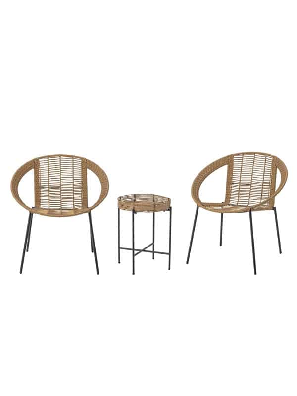 Dudine Lounge sættet fra Bloomingville er et sæt af tre dele til terrassen eller haven. Det består af to stabelbare loungestole og et rundt bord med hævet kant. Udført i lysebrun polyrattan og sort metal har det et let og elegant udtryk. Vi anbefaler at p
