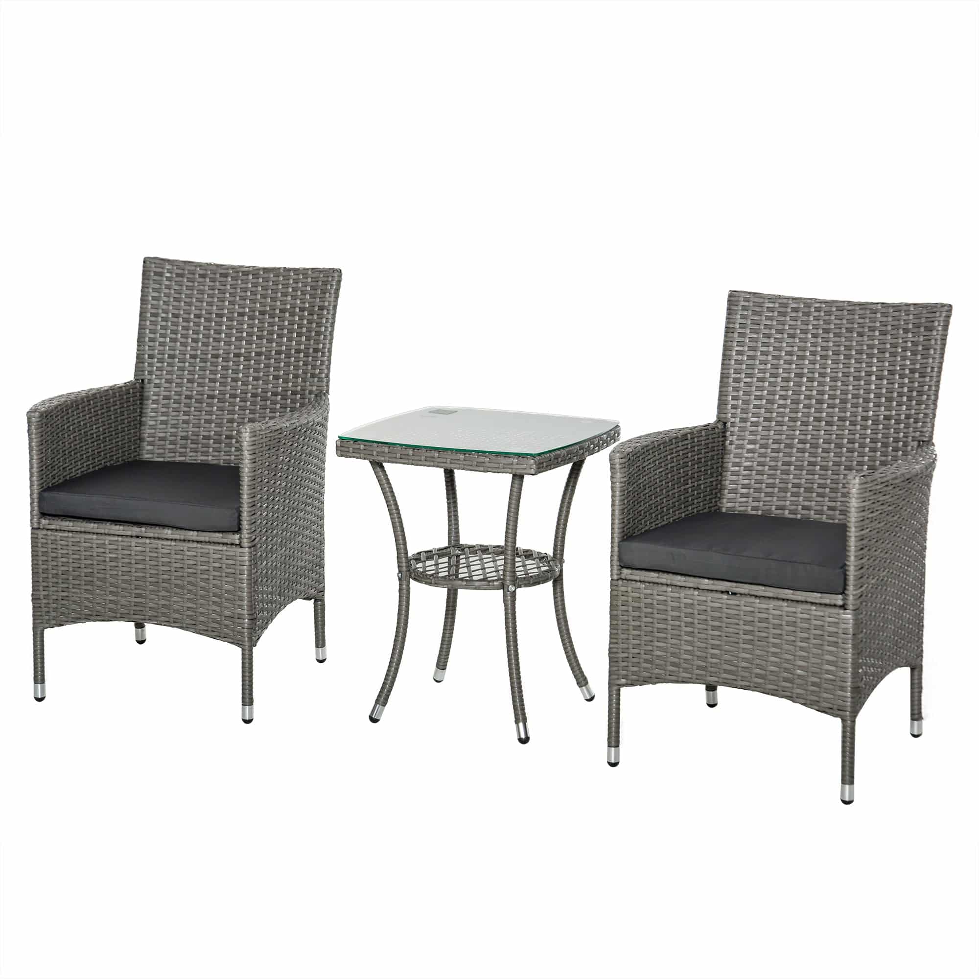 Havemøbelsæt i polyrattan, udendørs lounge med balkonmøbler til 2 personer, 3-delt siddegruppe, 2 stole, bordhynder, havelounge til haven, terrasse, balkon, grå